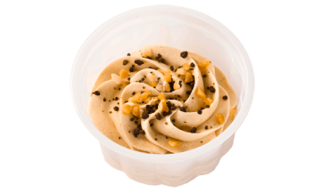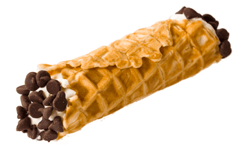 A wheat flour, vanilla-flavored pizzella cookie filled with our Lickety Split and stamped in carob chips.
