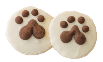 A crumbly, rice-flour cookie dipped in yogurt and decorated with a carob paw print.