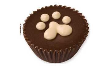 Our version of a peanut butter cup. It is grain-free, carob with peanut flavored center and decorated with a yogurt paw print.