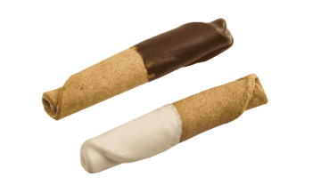 Two wheat flour, peanut flavored biscuits rolled tight. One is dipped in carob and the other is dipped in yogurt.